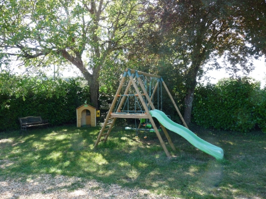 équipée de steamers et chaises longues, et offrant une belle vue sur champs et coteaux, ou dans le hamac surveillant portique et balançoires .